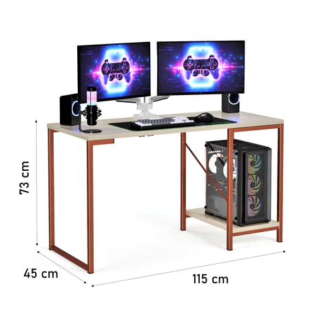 Com tampo de MDF resistente e estrutura em aço carbono com pintura em tinta a pó, a mesa oferece durabilidade e robustez, suportando até 20 kg distribuídos. Além disso, conta com duas prateleiras laterais, ideais para armazenar livros, documentos ou até objetos decorativos, deixando seu espaço sempre prático e elegante.